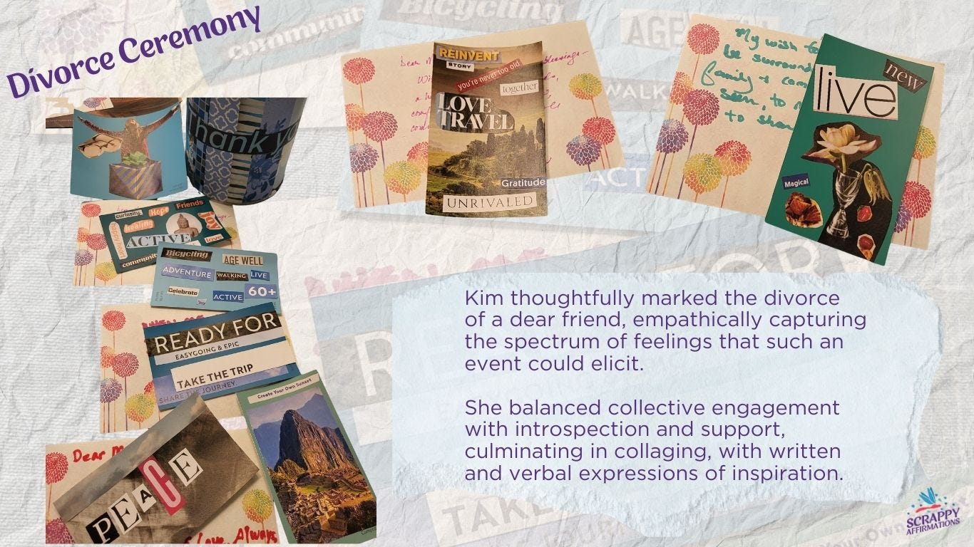 Scrappy Affirmations normalizes being human in a complicated world. We help you build resilience and find your mid-life mojo through creative workshops, transformative coaching, heartfelt ceremonies, and essential end-of-life planning.